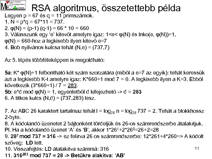 RSA algoritmus, összetettebb példa Legyen p = 67 és q = 11 prímszámok. 1. N = p*q = 67*11 = 737. 2. φ(N) = (p-1) (q-1) = 66 * 10 = 660 3. Válasszunk egy ‘e’ kitevőt amelyre igaz: 1