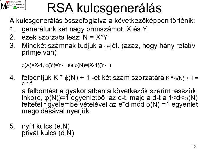 RSA kulcsgenerálás összefoglalva a következőképpen történik: 1. generálunk két nagy prímszámot. X és Y. 2. ezek szorzata lesz: N = X*Y 3. Mindkét számnak tudjuk a f-jét. (azaz, hogy hány relatív prímje van) f(X)=X-1, f(Y)=Y-1 és f(N)=(X-1)(Y-1) 4. felbontjuk K * f(N) + 1 -et két szám szorzatára K * f(N) + 1 = e*d a felbontást a gyakorlatban a következők szerint tesszük. lnko(e, φ(N))=1 egyenletből az e-t, majd a d-t a 1