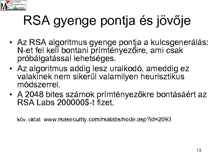 RSA gyenge pontja és jövője • Az RSA algoritmus gyenge pontja a kulcsgenerálás: N-et fel kell bontani prímtényezőire, ami csak próbálgatással lehetséges. • Az algoritmus addig lesz uralkodó, ameddig ez valakinek nem sikerül valamilyen heurisztikus módszerrel. • A 2048 bites számok prímtényezőkre bontásáért az RSA Labs 200000$-t fizet. köv. oldal: www. rsasecurity. com/rsalabs/node. asp? id=2093 13