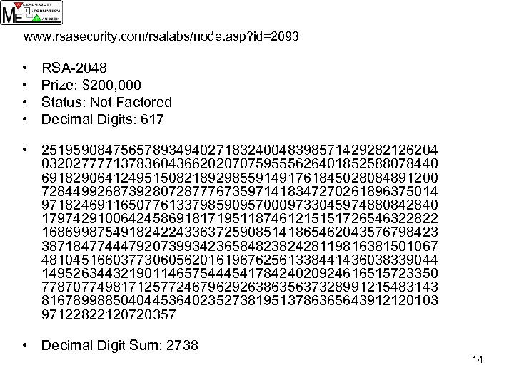 www. rsasecurity. com/rsalabs/node. asp? id=2093 • • RSA-2048 Prize: $200, 000 Status: Not Factored Decimal Digits: 617 • 25195908475657893494027183240048398571429282126204 03202777713783604366202070759555626401852588078440 69182906412495150821892985591491761845028084891200 72844992687392807287776735971418347270261896375014 97182469116507761337985909570009733045974880842840 17974291006424586918171951187461215151726546322822 16869987549182422433637259085141865462043576798423 38718477444792073993423658482382428119816381501067 48104516603773060562016196762561338441436038339044 14952634432190114657544454178424020924616515723350 77870774981712577246796292638635637328991215483143 81678998850404453640235273819513786365643912120103 97122822120720357 • Decimal Digit Sum: 2738 14
