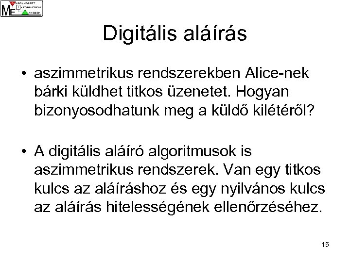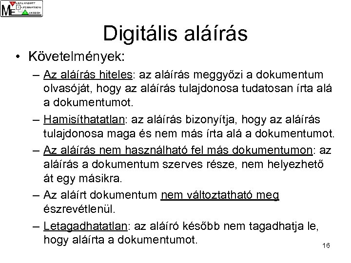 Digitális aláírás • aszimmetrikus rendszerekben Alice-nek bárki küldhet titkos üzenetet. Hogyan bizonyosodhatunk meg a küldő kilétéről? • A digitális aláíró algoritmusok is aszimmetrikus rendszerek. Van egy titkos kulcs az aláíráshoz és egy nyilvános kulcs az aláírás hitelességének ellenőrzéséhez. 15