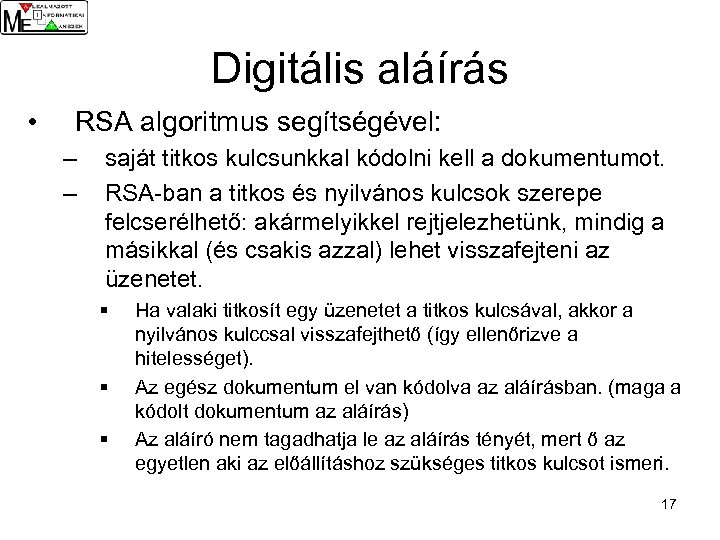 Digitális aláírás • Követelmények: – Az aláírás hiteles: az aláírás meggyőzi a dokumentum olvasóját, hogy az aláírás tulajdonosa tudatosan írta alá a dokumentumot. – Hamisíthatatlan: az aláírás bizonyítja, hogy az aláírás tulajdonosa maga és nem más írta alá a dokumentumot. – Az aláírás nem használható fel más dokumentumon: az aláírás a dokumentum szerves része, nem helyezhető át egy másikra. – Az aláírt dokumentum nem változtatható meg észrevétlenül. – Letagadhatatlan: az aláíró később nem tagadhatja le, hogy aláírta a dokumentumot. 16