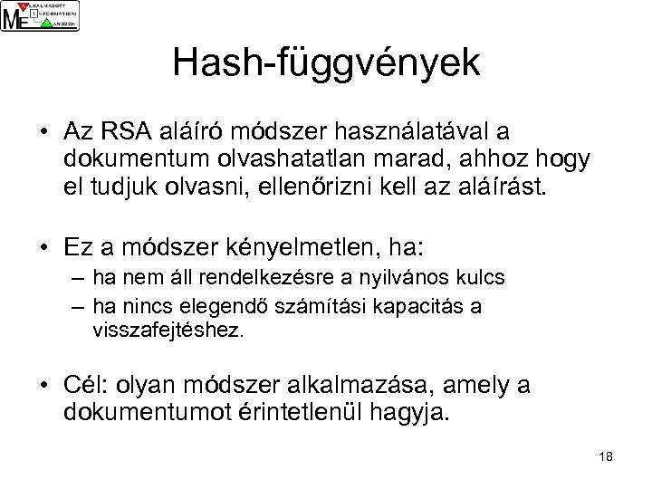 Digitális aláírás • RSA algoritmus segítségével: – – saját titkos kulcsunkkal kódolni kell a dokumentumot. RSA-ban a titkos és nyilvános kulcsok szerepe felcserélhető: akármelyikkel rejtjelezhetünk, mindig a másikkal (és csakis azzal) lehet visszafejteni az üzenetet. § § § Ha valaki titkosít egy üzenetet a titkos kulcsával, akkor a nyilvános kulccsal visszafejthető (így ellenőrizve a hitelességet). Az egész dokumentum el van kódolva az aláírásban. (maga a kódolt dokumentum az aláírás) Az aláíró nem tagadhatja le az aláírás tényét, mert ő az egyetlen aki az előállításhoz szükséges titkos kulcsot ismeri. 17