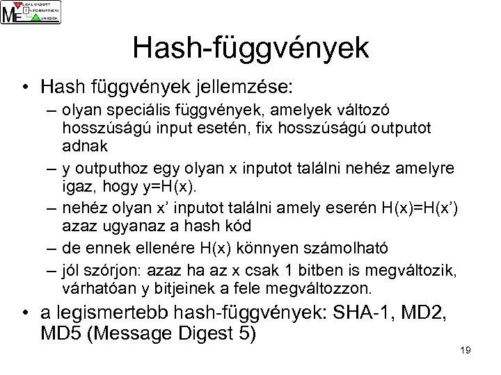 Hash-függvények • Az RSA aláíró módszer használatával a dokumentum olvashatatlan marad, ahhoz hogy el tudjuk olvasni, ellenőrizni kell az aláírást. • Ez a módszer kényelmetlen, ha: – ha nem áll rendelkezésre a nyilvános kulcs – ha nincs elegendő számítási kapacitás a visszafejtéshez. • Cél: olyan módszer alkalmazása, amely a dokumentumot érintetlenül hagyja. 18