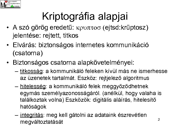 Kriptográfia alapjai • A szó görög eredetű: kruptos (ejtsd: krüptosz) jelentése: rejtett, titkos • Elvárás: biztonságos internetes kommunikáció (csatorna) • Biztonságos csatorna alapkövetelményei: – titkosság: a kommunikáló feleken kívül más ne ismerhesse az üzenetek tartalmát. Eszköz: rejtjelező algoritmus – hitelesség: a kommunikáló felek meggyőződhetnek egymás személyazonosságáról. (anélkül, hogy valaha is találkoztak volna) Eszközök: digitális aláírás, hitelesítő hatóságok – integritás: meg kell gátolni az adataink észrevétlen 2 megváltoztatását