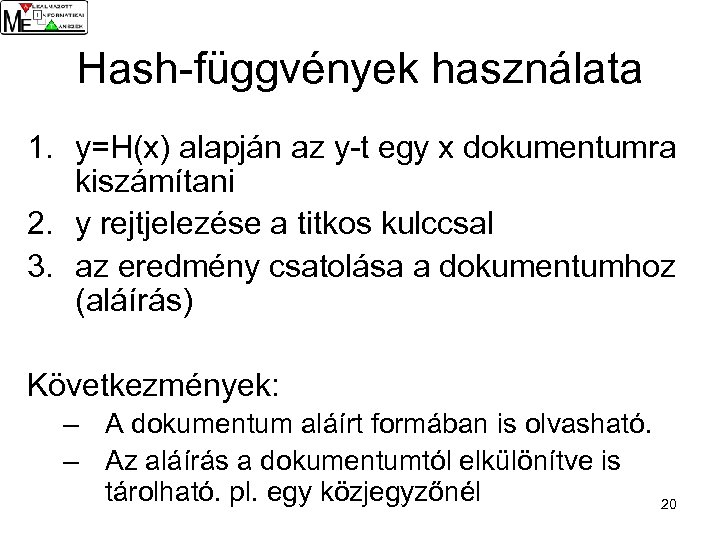 Hash-függvények • Hash függvények jellemzése: – olyan speciális függvények, amelyek változó hosszúságú input esetén, fix hosszúságú outputot adnak – y outputhoz egy olyan x inputot találni nehéz amelyre igaz, hogy y=H(x). – nehéz olyan x’ inputot találni amely eserén H(x)=H(x’) azaz ugyanaz a hash kód – de ennek ellenére H(x) könnyen számolható – jól szórjon: azaz ha az x csak 1 bitben is megváltozik, várhatóan y bitjeinek a fele megváltozzon. • a legismertebb hash-függvények: SHA-1, MD 2, MD 5 (Message Digest 5) 19