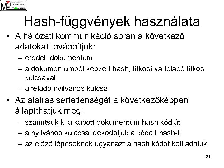 Hash-függvények használata 1. y=H(x) alapján az y-t egy x dokumentumra kiszámítani 2. y rejtjelezése a titkos kulccsal 3. az eredmény csatolása a dokumentumhoz (aláírás) Következmények: – A dokumentum aláírt formában is olvasható. – Az aláírás a dokumentumtól elkülönítve is tárolható. pl. egy közjegyzőnél 20