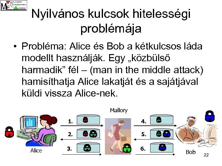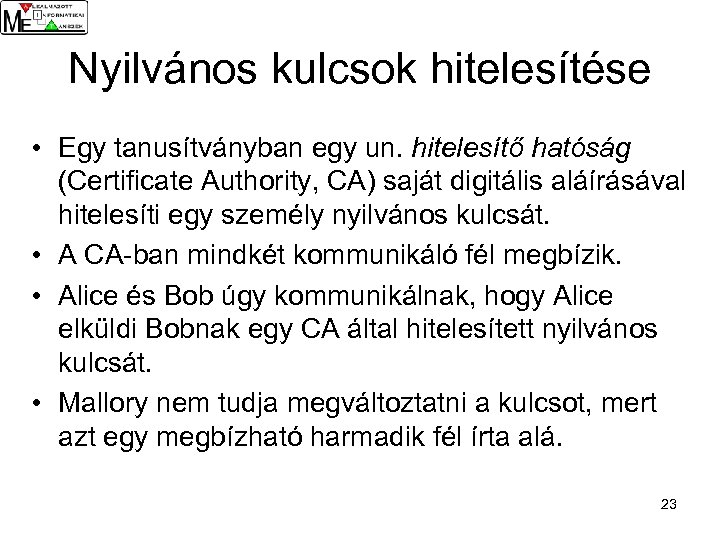Nyilvános kulcsok hitelességi problémája • Probléma: Alice és Bob a kétkulcsos láda modellt használják. Egy „közbülső harmadik” fél – (man in the middle attack) hamisíthatja Alice lakatját és a sajátjával küldi vissza Alice-nek. Mallory 1. 2. Alice 4. 5. 3. 6. Bob 22