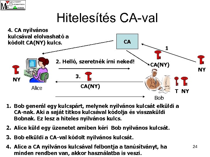 Nyilvános kulcsok hitelesítése • Egy tanusítványban egy un. hitelesítő hatóság (Certificate Authority, CA) saját digitális aláírásával hitelesíti egy személy nyilvános kulcsát. • A CA-ban mindkét kommunikáló fél megbízik. • Alice és Bob úgy kommunikálnak, hogy Alice elküldi Bobnak egy CA által hitelesített nyilvános kulcsát. • Mallory nem tudja megváltoztatni a kulcsot, mert azt egy megbízható harmadik fél írta alá. 23