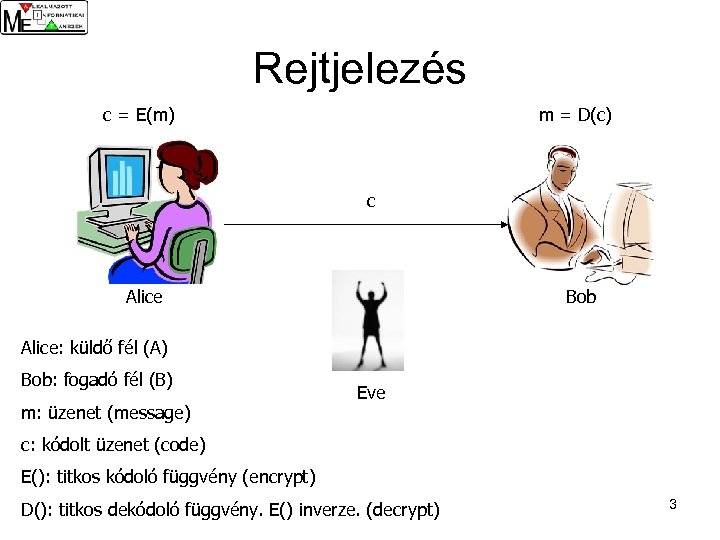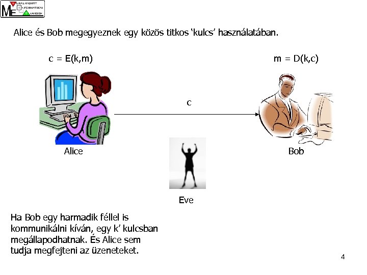 Rejtjelezés c = E(m) m = D(c) c Alice Bob Alice: küldő fél (A) Bob: fogadó fél (B) m: üzenet (message) Eve c: kódolt üzenet (code) E(): titkos kódoló függvény (encrypt) D(): titkos dekódoló függvény. E() inverze. (decrypt) 3