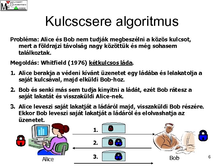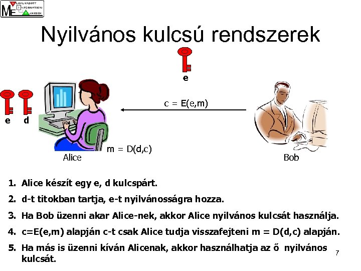Kulcscsere algoritmus Probléma: Alice és Bob nem tudják megbeszélni a közös kulcsot, mert a földrajzi távolság nagy közöttük és még sohasem találkoztak. Megoldás: Whitfield (1976) kétkulcsos láda. 1. Alice berakja a védeni kívánt üzenetet egy ládába és lelakatolja a saját kulcsával, majd elküldi Bob-hoz. 2. Bob és senki más sem tudja kinyitni a ládát, ezét Bob rátesz a saját lakatát és visszaküldi Alice-nek. 3. Alice leveszi saját lakatját a ládáról majd, visszaküldi Bob részére. Ekkor Bob leveszi saját lakatját a ládáról és elolvashatja az üzenetet. 1. 2. Alice 3. Bob 6