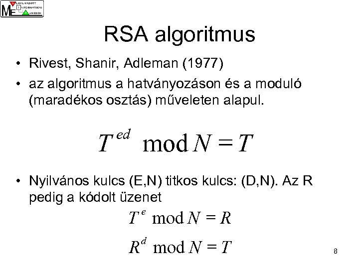 Nyilvános kulcsú rendszerek e c = E(e, m) e d Alice m = D(d, c) Bob 1. Alice készít egy e, d kulcspárt. 2. d-t titokban tartja, e-t nyilvánosságra hozza. 3. Ha Bob üzenni akar Alice-nek, akkor Alice nyilvános kulcsát használja. 4. c=E(e, m) alapján c-t csak Alice tudja visszafejteni m = D(d, c) alapján. 5. Ha más is üzenni kíván Alicenak, akkor használhatja az ő nyilvános kulcsát. 7