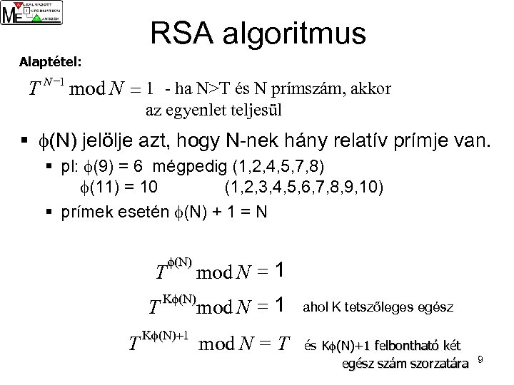 RSA algoritmus • Rivest, Shanir, Adleman (1977) • az algoritmus a hatványozáson és a moduló (maradékos osztás) műveleten alapul. T ed mod N = T • Nyilvános kulcs (E, N) titkos kulcs: (D, N). Az R pedig a kódolt üzenet T mod N = R e R mod N = T d 8