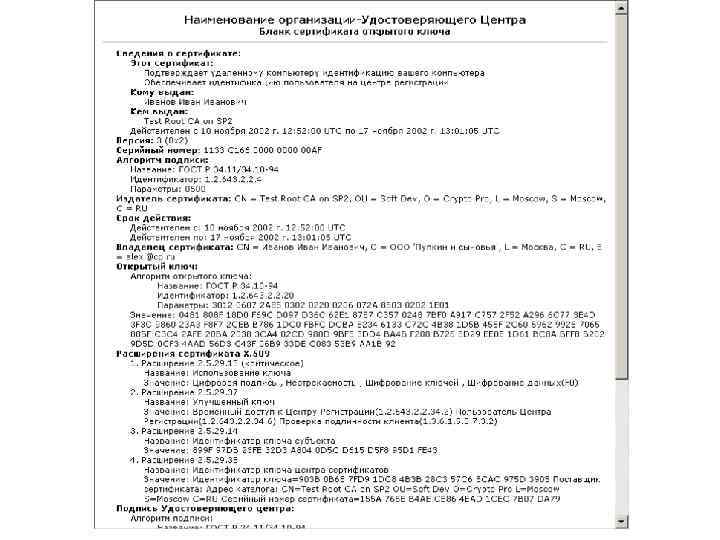 Список отозванных сертификатов Certificate Revocation List Список отозванных сертификатов Подписан Центром сертификации Должен публиковаться и регулярно обновляться каждым CA Active Directory Web Файловая система Сертификат содержит список узлов публикации CRL