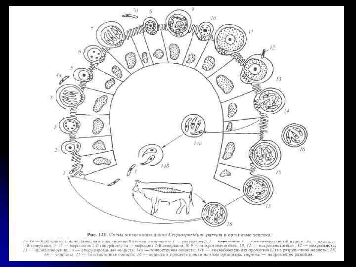 Жизненный цикл Инвазионные ооцисты (4 спорозоита) попадают per os в организм животного или человека, в проксимальном отделе кишечника оболочка ооцисты разрушается, а освобождающиеся спорозоиты движутся в направлении энтороцитов кишечника, достигают зоны микроворсинок, но задерживаются на границе эпителиальной клетки, не погружаясь в ее цитоплазму. Микроворсинки, окружающие спорозоит, как бы вырастают ему навстречу, увеличиваются в размерах и далее смыкаются над растущим трофозоитом. После смыкания микроворсинок над паразитом он оказывается внутри своеобразной паразитофорной вакуоли, ограниченной двумя мембранами слившихся микроворсинок. В результате образуется зона взаимодействия паразита и хозяина. Возникает необычная локализация паразита – внутри клетки, но вне цитоплазмы в так называемой экстроцитоплазматической паразитофорной вакуоли, под защитой которой протекает все последующее эндогенное развитие паразита. Затем трофозоиты (делящиеся клетки), трансформирующиеся в меронты, распадаются на 8 мерозоитов. Они дают начало меронтам 2 -ой генерации (процесс мерогонии).