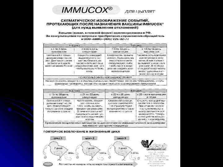 l l Эта проблема отсутствует применении живых вакцин. Количество ооцист в дозе живой вакцины позволяет полностью, без побочных эффектов выстроить иммунитет к патогенным кокцидиям. Применение живых вакцин не требует технологических перерывов, ротационных программ с кокцидиостатиками и т. д. На всякий случай ученые выработали эффективные методы понижения количества ооцист в случае чрезмерного их размножения через 14 дней после вакцинации, являющихся следствием технологических ошибок в содержании птиц. Достаточно дачи 50% дозы медикаментов, таких, как ампролиум в течение 2 суток или альтернативная дача одной партии корма с кокцидиостатиками (2 -3 дня). На сегодняшний момент - это наиболее дешевый метод, который исключает риск внесения инвазии в производство, дающий возможность полного использования свойств живых вакцин против кокцидиоза.