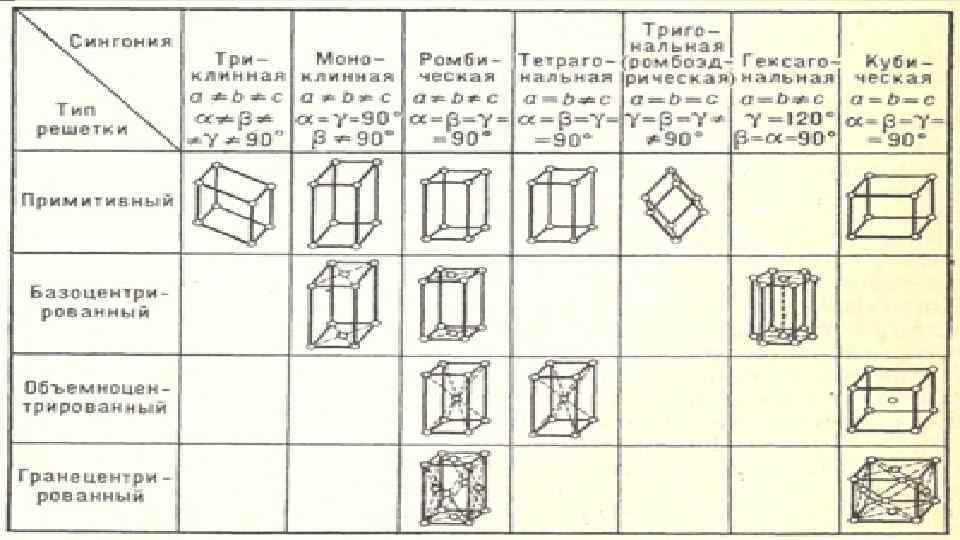 Кез келген кристаллды төмендегідей типтерге жіктеуге болады: Р – примитивті ұяшық, бір түйінді элементар ұяшық A, B, C – бір қырға екі түйін сәйкес келетін тор: А- түйін а қабырғада орналасқан, В- в қабырғада орналасқан, С- базоцентрленген тор І – объемноцентрированная решетка Ғ – гранецентрированная решетка, А+В+С, төрт түйінді элементар ұяшық