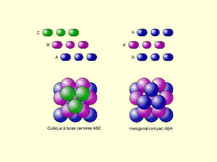 Плотнейшие упаковки частиц в кристаллах Постройка из атомов или ионов молекул должна обладать минимальной внутренней энергией Способ заполнения пространства шарами одинакового радиуса, при котором расстояние между центрами частиц минимальны, называются плотнейшими упаковками Гексагональная плотнейшая упаковка получается при последовательной укладке слоев с гексагональной упаковкой слоев. Шары одинакового радиуса в одном слое максимально плотно можно уложить единственным способом: каждый шар окружен в слое шестью ближайшими соседями, между ним и его соседями имеются треугольные промежутки (слой А). Второй плотно упакованной слой тоже можно получить единственным способом: (слой В), у каждого верхнего шара будут три одинаковых соседа в нижнем слое и, наоборот, каждый нижний шар будет соприкасаться с тремя верхними. В гексагональной упаковке шаров третий слой точно повторяет первый, и упаковка оказывается двухслойной и запишется как чередование двух слоев А и В: АВ АВ АВ. В кубической упаковке шаров шары третьего слоя (слой С) находятся над пустотами первого, вся упаковка трехслойная, повторение мотива наступает в четвертом слое, в буквенном обозначении запишется как АВС АВС ….