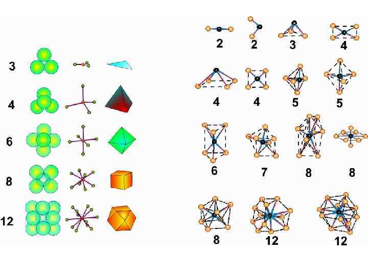 Координаційне число • можливі координаційні числа: • Чим більш міцніший 2, 3, 4, 5, 6, 7, 8, 9, 10, зв’язок тим менше КЧ 11, 12. • міжатомна віддаль КЧ ~ ------------ ковалентність зв’язку