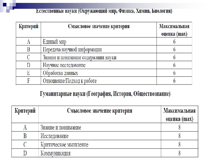 Источники информации оценивания n работы учащихся (домашние задания, минипроекты и презентации, разнообразные тексты, отчеты о наблюдениях и экспериментах, дневники, собранные массивы данных, подборки информационных материалов, а также разнообразные инициативные творческие работы); n индивидуальная и совместная деятельность учащихся в ходе выполнения работ; n статистические данные, основанные на ясно выраженных показателях и получаемые в ходе целенаправленных наблюдений или миниисследований; n результаты тестирования (результаты устных и письменных проверочных работ).