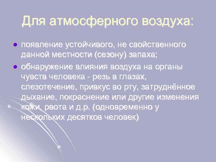 Для атмосферного воздуха: l l появление устойчивого, не свойственного данной местности (сезону) запаха; обнаружение влияния воздуха на органы чувств человека - резь в глазах, слезотечение, привкус во рту, затруднённое дыхание, покраснение или другие изменения кожи, рвота и д. р. (одновременно у нескольких десятков человек)