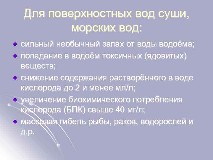 Для поверхностных вод суши, морских вод: l l l сильный необычный запах от воды водоёма; попадание в водоём токсичных (ядовитых) веществ; снижение содержания растворённого в воде кислорода до 2 и менее мл/л; увеличение биохимического потребления кислорода (БПК) свыше 40 мг/л; массовая гибель рыбы, раков, водорослей и д. р.