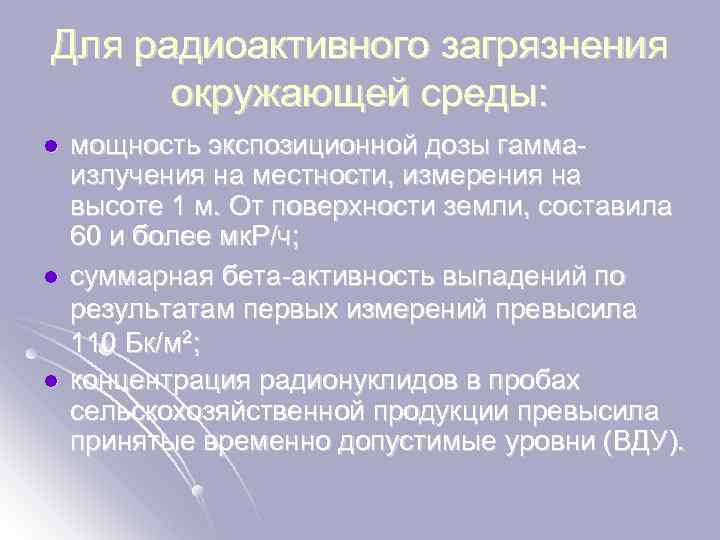 Для радиоактивного загрязнения окружающей среды: l l l мощность экспозиционной дозы гаммаизлучения на местности, измерения на высоте 1 м. От поверхности земли, составила 60 и более мк. Р/ч; суммарная бета-активность выпадений по результатам первых измерений превысила 110 Бк/м 2; концентрация радионуклидов в пробах сельскохозяйственной продукции превысила принятые временно допустимые уровни (ВДУ).