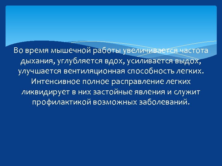 Во время мышечной работы увеличивается частота дыхания, углубляется вдох, усиливается выдох, улучшается вентиляционная способность легких. Интенсивное полное расправление легких ликвидирует в них застойные явления и служит профилактикой возможных заболеваний.