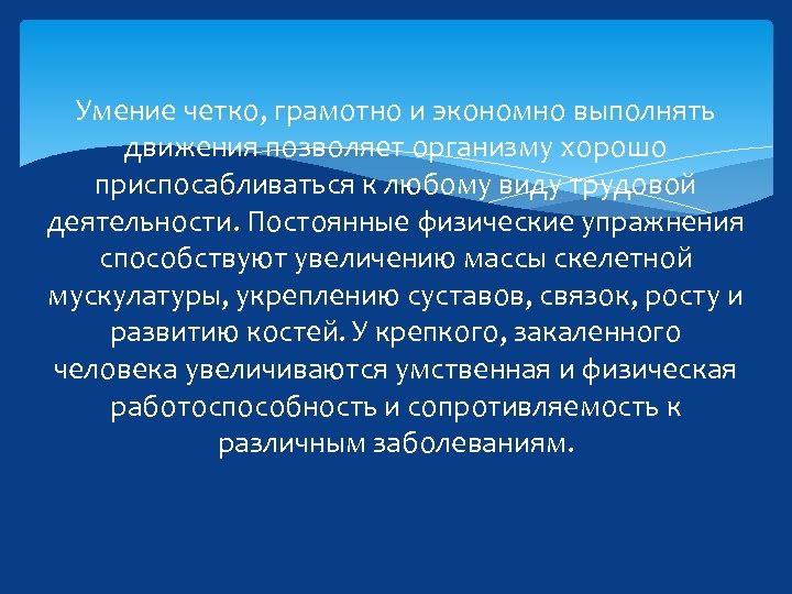 Умение четко, грамотно и экономно выполнять движения позволяет организму хорошо приспосабливаться к любому виду трудовой деятельности. Постоянные физические упражнения способствуют увеличению массы скелетной мускулатуры, укреплению суставов, связок, росту и развитию костей. У крепкого, закаленного человека увеличиваются умственная и физическая работоспособность и сопротивляемость к различным заболеваниям.