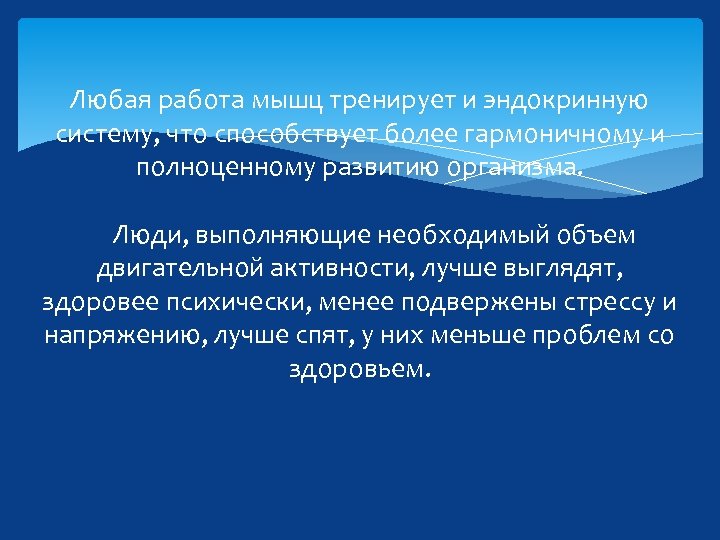 Любая работа мышц тренирует и эндокринную систему, что способствует более гармоничному и полноценному развитию организма. Люди, выполняющие необходимый объем двигательной активности, лучше выглядят, здоровее психически, менее подвержены стрессу и напряжению, лучше спят, у них меньше проблем со здоровьем.