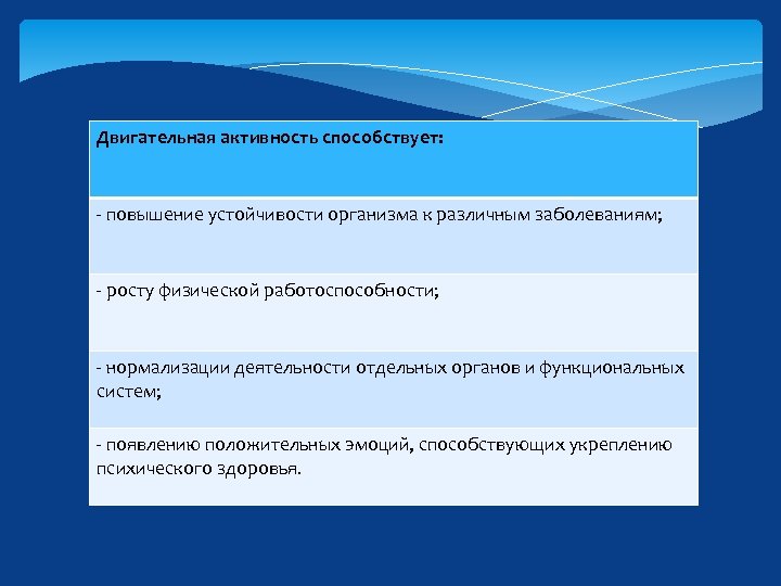 Двигательная активность способствует: - повышение устойчивости организма к различным заболеваниям; - росту физической работоспособности; - нормализации деятельности отдельных органов и функциональных систем; - появлению положительных эмоций, способствующих укреплению психического здоровья.