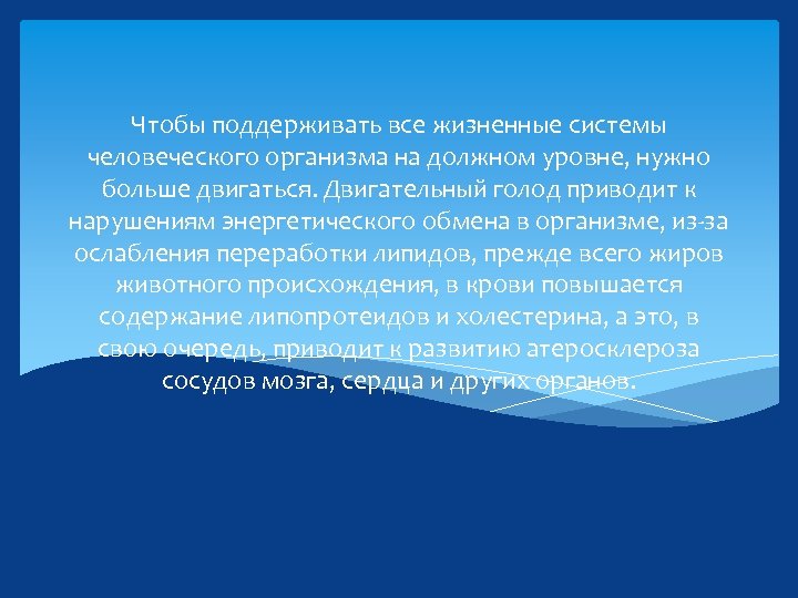 Чтобы поддерживать все жизненные системы человеческого организма на должном уровне, нужно больше двигаться. Двигательный голод приводит к нарушениям энергетического обмена в организме, из-за ослабления переработки липидов, прежде всего жиров животного происхождения, в крови повышается содержание липопротеидов и холестерина, а это, в свою очередь, приводит к развитию атеросклероза сосудов мозга, сердца и других органов.