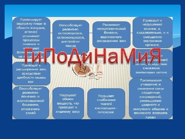 Виды гипокинезии и причины ее возникновения Виды гипокинезии: Классификационный признак – причина и мотивации гипокинезии: Физиологическая Влияние генетических факторов, наличие моторной “дебильности”, аномалии развития Привычно-бытовая Привыкание к малоподвижному образу жизни, наличие сниженной двигательной инициативности, бытовой комфорт, пренебрежение физической культурой Клиническая (”нозогенная”) Ограничение объема движений вследствие производственной необходимости Заболевания опорнодвигательного аппарата, болезни и травмы, требующие длительного постельного режима Школьная Неправильная организация учебно-воспитательного процесса: перегрузка учебными занятиями, игнорирование физического воспитания, отсутствие свободного времени Климатогеографическая Неблагоприятные климатические или географические условия, ограничивающие двигательную активность Экспериментальная Моделирование сниженной двигательной активности для проведения медико-биологических исследований