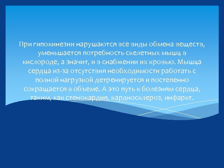 При гипокинезии нарушаются все виды обмена веществ, уменьшается потребность скелетных мышц в кислороде, а значит, и в снабжении их кровью. Мышца сердца из-за отсутствия необходимости работать с полной нагрузкой детренируется и постепенно сокращается в объеме. А это путь к болезням сердца, таким, как стенокардия, кардиосклероз, инфаркт.