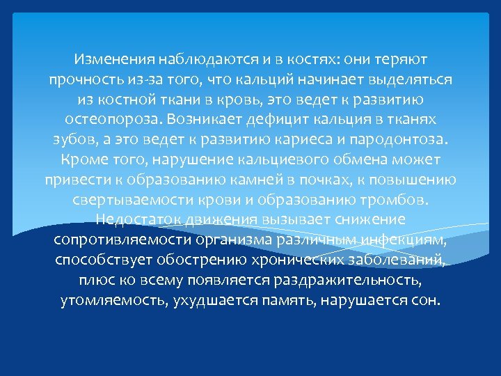 Изменения наблюдаются и в костях: они теряют прочность из-за того, что кальций начинает выделяться из костной ткани в кровь, это ведет к развитию остеопороза. Возникает дефицит кальция в тканях зубов, а это ведет к развитию кариеса и пародонтоза. Кроме того, нарушение кальциевого обмена может привести к образованию камней в почках, к повышению свертываемости крови и образованию тромбов. Недостаток движения вызывает снижение сопротивляемости организма различным инфекциям, способствует обострению хронических заболеваний, плюс ко всему появляется раздражительность, утомляемость, ухудшается память, нарушается сон.