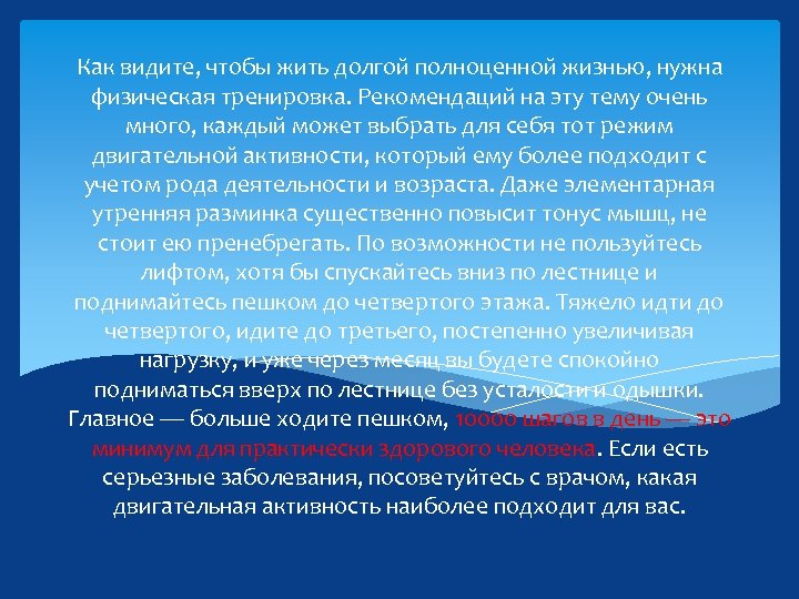 Как видите, чтобы жить долгой полноценной жизнью, нужна физическая тренировка. Рекомендаций на эту тему очень много, каждый может выбрать для себя тот режим двигательной активности, который ему более подходит с учетом рода деятельности и возраста. Даже элементарная утренняя разминка существенно повысит тонус мышц, не стоит ею пренебрегать. По возможности не пользуйтесь лифтом, хотя бы спускайтесь вниз по лестнице и поднимайтесь пешком до четвертого этажа. Тяжело идти до четвертого, идите до третьего, постепенно увеличивая нагрузку, и уже через месяц вы будете спокойно подниматься вверх по лестнице без усталости и одышки. Главное — больше ходите пешком, 10000 шагов в день — это минимум для практически здорового человека. Если есть серьезные заболевания, посоветуйтесь с врачом, какая двигательная активность наиболее подходит для вас.