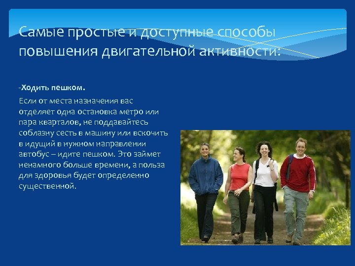 Самые простые и доступные способы повышения двигательной активности: -Ходить пешком. Если от места назначения вас отделяет одна остановка метро или пара кварталов, не поддавайтесь соблазну сесть в машину или вскочить в идущий в нужном направлении автобус – идите пешком. Это займет ненамного больше времени, а польза для здоровья будет определенно существенной.