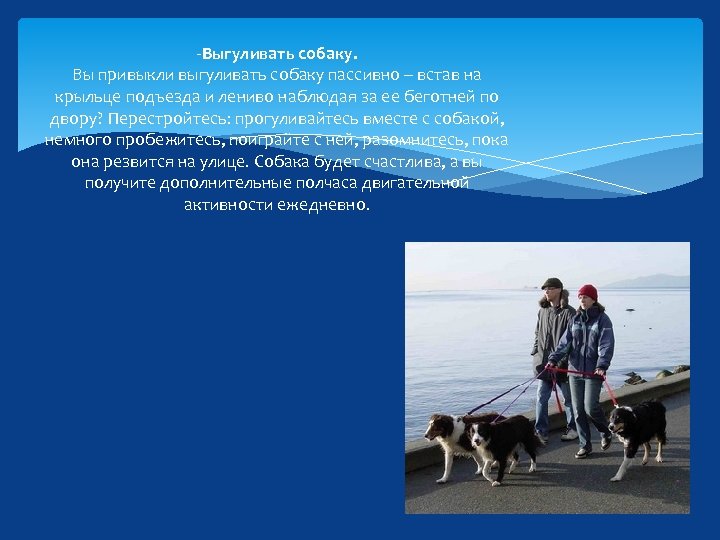 -Выгуливать собаку. Вы привыкли выгуливать собаку пассивно – встав на крыльце подъезда и лениво наблюдая за ее беготней по двору? Перестройтесь: прогуливайтесь вместе с собакой, немного пробежитесь, поиграйте с ней, разомнитесь, пока она резвится на улице. Собака будет счастлива, а вы получите дополнительные полчаса двигательной активности ежедневно.