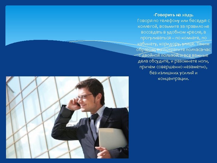 -Говорить на ходу. Говоря по телефону или беседуя с коллегой, возьмите за правило не восседать в удобном кресле, а прогуливаться – по комнате, по кабинету, коридору, улице. Таким образом, вы потратите полчаса-час с двойной пользой: и все важные дела обсудите, и разомнете ноги, причем совершенно незаметно, без излишних усилий и концентрации.