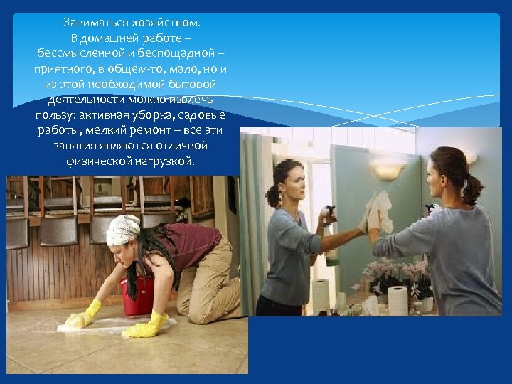 -Заниматься хозяйством. В домашней работе – бессмысленной и беспощадной – приятного, в общем-то, мало, но и из этой необходимой бытовой деятельности можно извлечь пользу: активная уборка, садовые работы, мелкий ремонт – все эти занятия являются отличной физической нагрузкой.