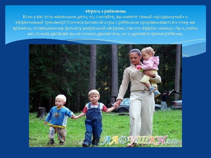 -Играть с ребенком. Если у вас есть маленькие дети, то, считайте, вы имеете самый «продвинутый» и эффективный тренажер! Полчаса активной игры с ребенком приравниваются к тому же времени, посвященному фитнесу умеренной нагрузки, так что эффект налицо. Ну и, опять же, польза двойная: вы не только двигаетесь, но и уделяете время ребенку.