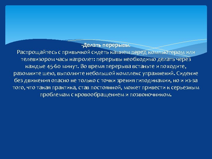 -Делать перерывы. Распрощайтесь с привычкой сидеть камнем перед компьютером или телевизором часы напролет: перерывы необходимо делать через каждые 45 -60 минут. Во время перерыва встаньте и походите, разомните шею, выполните небольшой комплекс упражнений. Сидение без движения опасно не только с точки зрения гиподинамии, но и из-за того, что такая практика, став постоянной, может привести к серьезным проблемам с кровообращением и позвоночником.