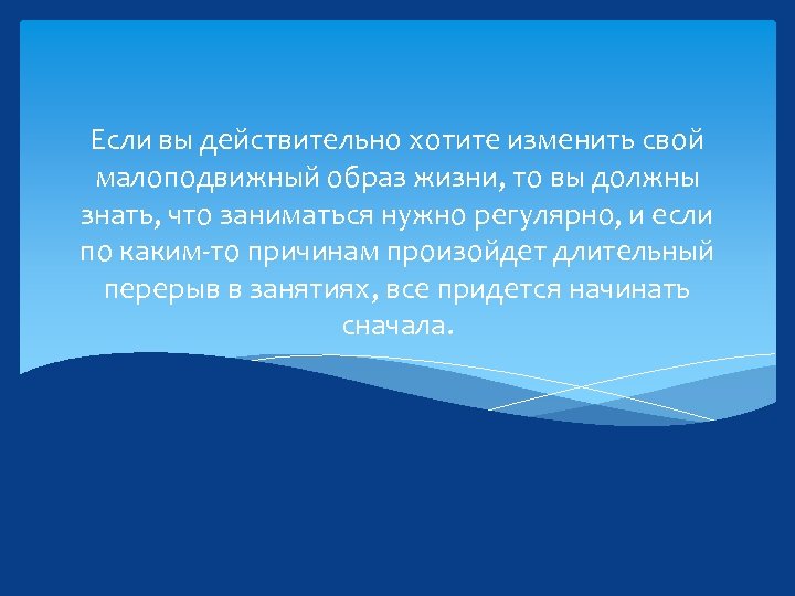 Если вы действительно хотите изменить свой малоподвижный образ жизни, то вы должны знать, что заниматься нужно регулярно, и если по каким-то причинам произойдет длительный перерыв в занятиях, все придется начинать сначала.