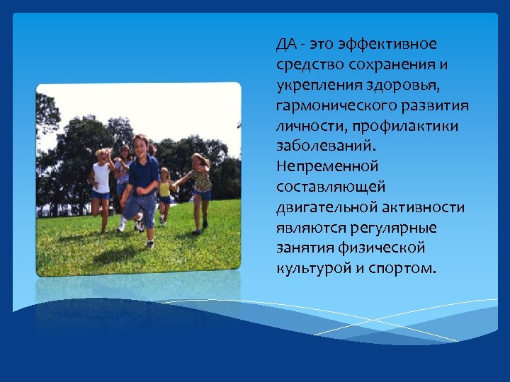 ДА - это эффективное средство сохранения и укрепления здоровья, гармонического развития личности, профилактики заболеваний. Непременной составляющей двигательной активности являются регулярные занятия физической культурой и спортом.