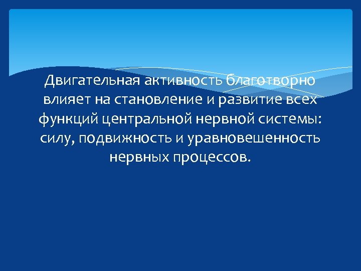 Двигательная активность благотворно влияет на становление и развитие всех функций центральной нервной системы: силу, подвижность и уравновешенность нервных процессов.