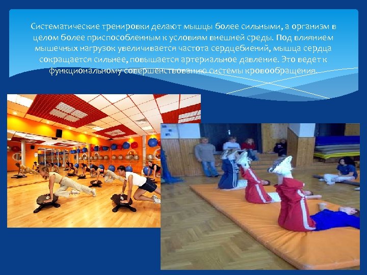 Систематические тренировки делают мышцы более сильными, а организм в целом более приспособленным к условиям внешней среды. Под влиянием мышечных нагрузок увеличивается частота сердцебиений, мышца сердца сокращается сильнее, повышается артериальное давление. Это ведет к функциональному совершенствованию системы кровообращения.
