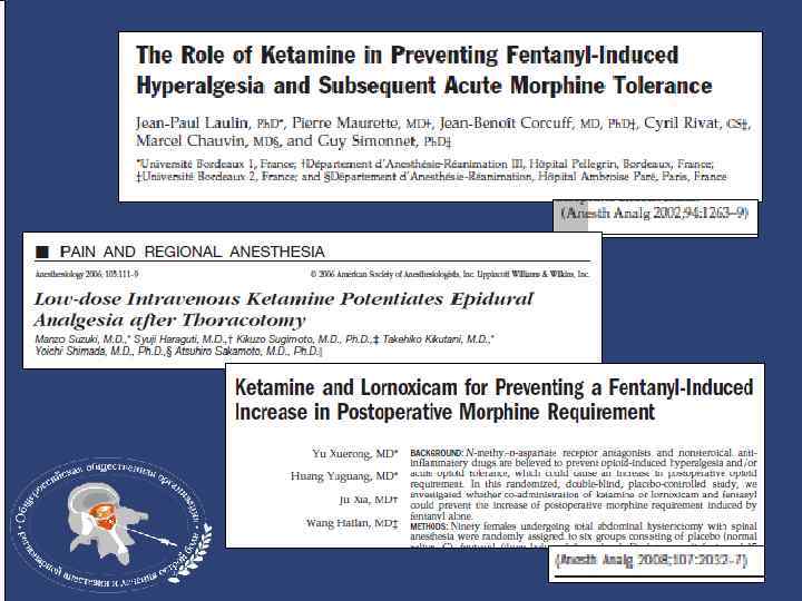 Кетамин • На фоне превентивного введения кетамина время 1 -го требования анальгетика удлиняется ≈ на 35% • Послеоперационная потребность в анальгетиках (морфин) снижается в 1, 5 -2 раза • В большей степени снижается интенсивность динамической боли, чем C (Kwok R et al. //Anesth. Analg; 2004, Launo et al. // Minerva Anesthesiol; 2004) боли в покое