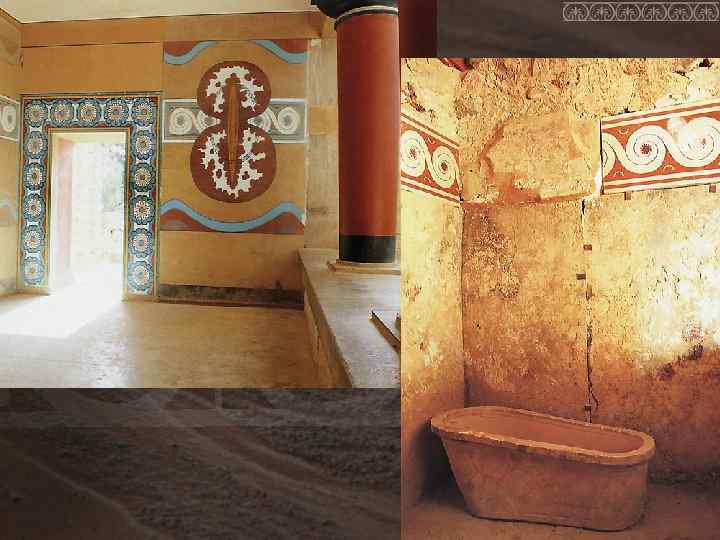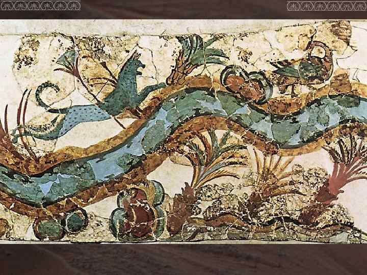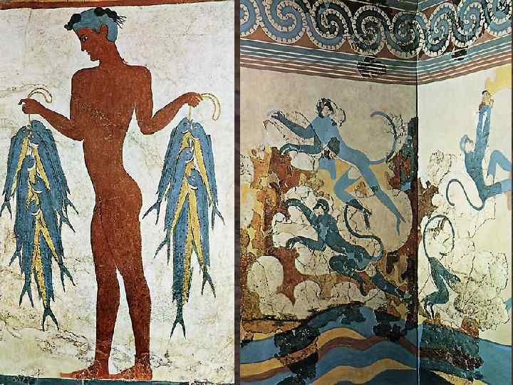 Пространство дворца зыбко, неустойчиво, неопределенно. Перемещение по нему сродни покачиванию на поверхности моря, которое шумит снаружи и как бы проникает внутрь ласковым бризом и восхитительным орнаментом на стенах. Выпрыгивающие на поверхность дельфины, снующие в разные стороны рыбы, упругий завиток и волнистые линии — основной мотив фресковой живописи в камерных покоях, на террасах, в коридорах. Все пронизано динамикой морской стихии: грозным рокотом набегающих волн, свежим ветром, надувающим паруса кораблей, розоватыми брызгами пен.