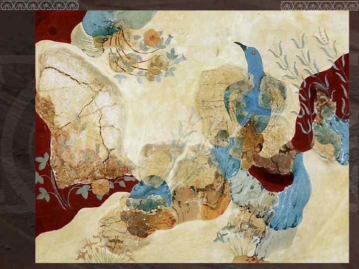 • Динамичная линия уступила место застывшим формам и сухому орнаменту; в красочной гамме вместо холодноватых серебристых тонов стали преобладать теплые сочные цвета. Живописность, • подвижность, эфемерность критского искусства сменились жесткостью, статичностью, приземленностью микенского