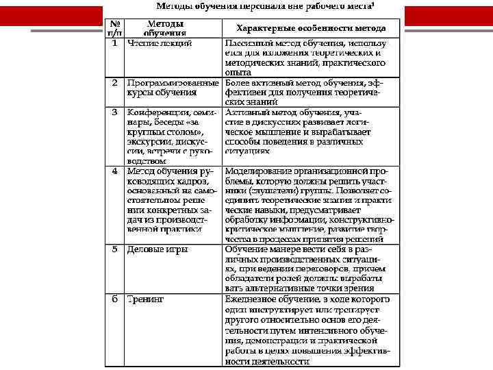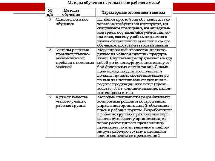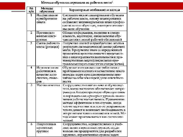 Самые распространенные и эффективные методы обучения ■ Обучение на рабочем месте: Наставничество — практическая передача знаний более опытным работником менее опытному без отрыва от производственного процесса с помощью следующих методов: «посмотри, как делаю я, и повтори» ; «сделай, а я исправлю ошибки» , «начинай, а в процессе работы я тебя направлю» . Secondment — это «командирование» персонала на определенное время в другую структуру для овладения необходимыми навыками. Сотрудника на время отправляют в другой департамент той же компании или в другую организацию. Secondment может быть как краткосрочным (около 100 часов рабочего времени), так и более длительным (до года). В США и Европе Secondment является очень популярным. В России более популярен метод наставничества.
